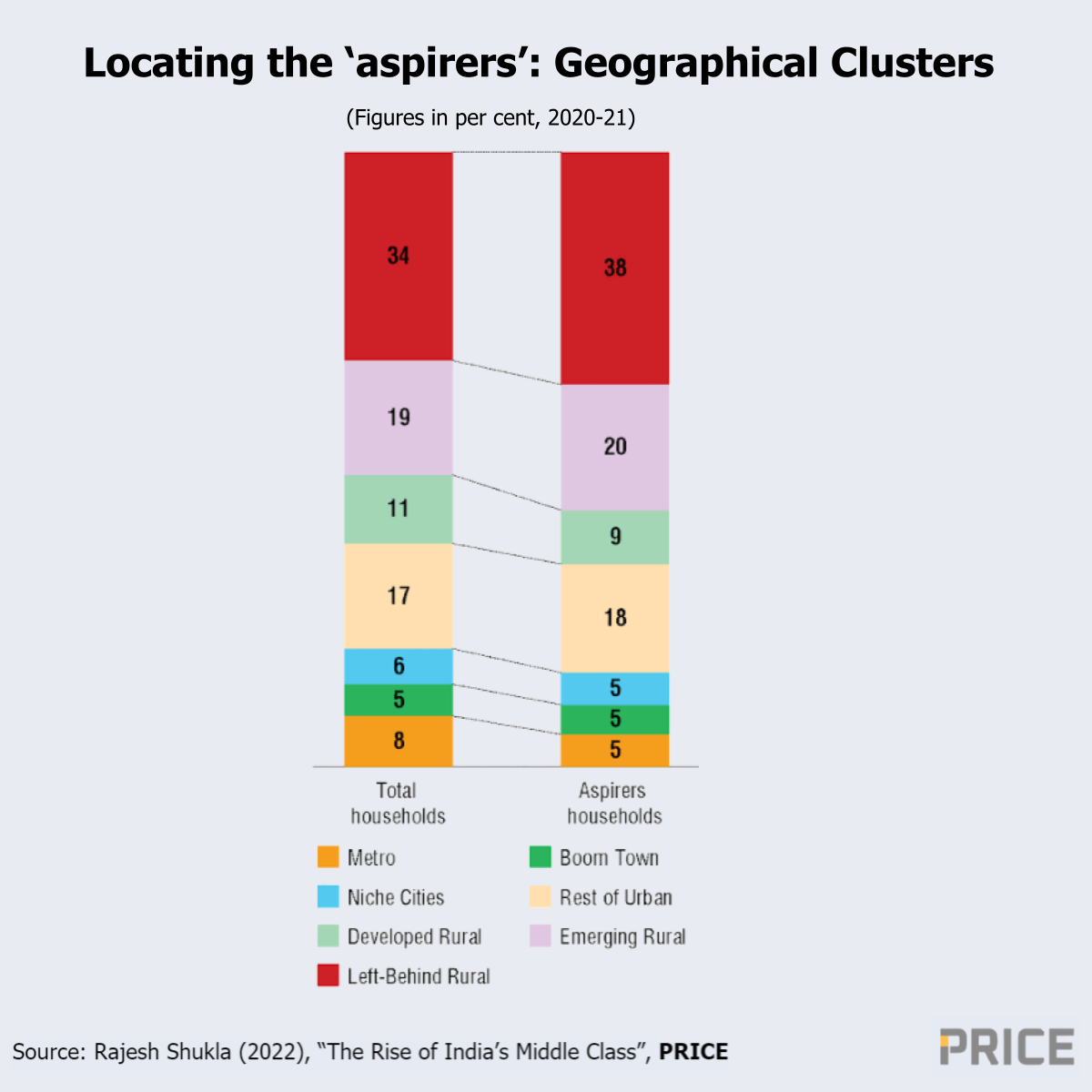 The proportion of Aspirers (Annual household income is from Rs. 1,25,000 to Rs. 5,00,000 at 2020-21 prices) living in rural areas is expected to increase, from 69 percent in 2020-21 to 77 percent in 2030-31. As in the case of other income classes, a higher proportion of people is found in rural areas and small towns. Nearly 18 percent of Aspirers live in small towns with a population of less than a million. Under 5 per cent of Aspirers live in metros.
