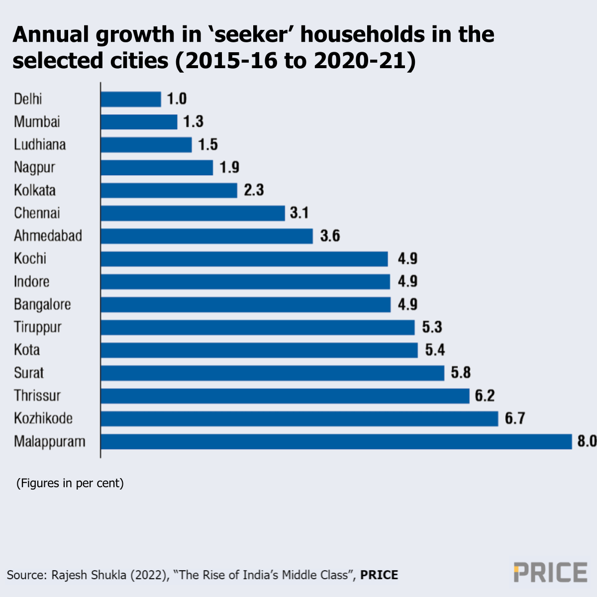 Delhi tops the list of cities, it is Malappuram that has witnessed the highest annual growth in the number of Seeker households between 2015-16 to 2020-21 (8.1 percent), followed by Kozhikode (6.7 percent), Thrissur (6.2 percent), Raipur (5.9 percent), Surat (5.8 percent), and Thiruvananthapuram (5.5 percent). Delhi, not surprisingly, is at the bottom of the heap, with an annual increase of just 1 percent during this period.